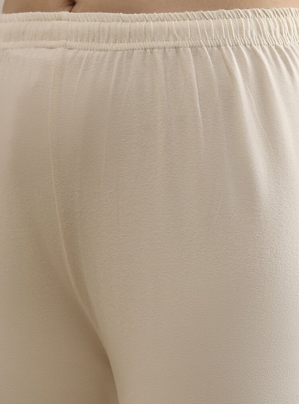 This elegant alia kurta set is perfect for festive occasions. The kurta features intricate foil prints, a V-neckline with embellishments and 3/4th sleeves, adding charm and sophistication. Paired with churidar pants featuring an elasticated waistband, it is complemented by a dupatta with a solid design and an embellished border.