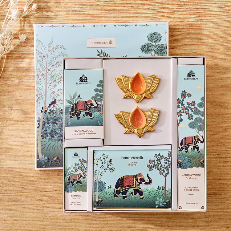 This exquisite set brings a touch of tranquillity and divine fragrance to any space. This thoughtfully curated set includes aromatic guggul cups, incense sticks, and dhoop sticks designed to enrich your senses. Additionally, the five-blend pooja oil and lotus diyas add a sacred touch to your rituals. The sandalwood fragrance brings a serene ambience for meditation or prayer.