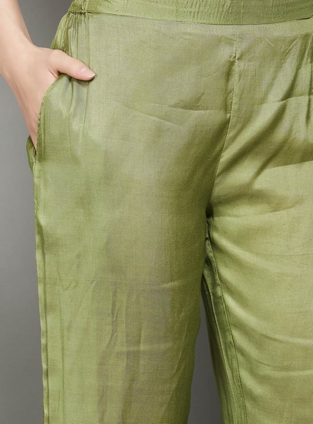 This elegant straight kurta set is perfect for festive occasions. The kurta features intricate embroidery with sequins with a V-neckline, 3/4th sleeves, and a straight hemline for a refined look. The solid palazzos have an elasticated waistband and side pockets. It comes with a dupatta adorned with embroidered scalloped borders for a charming finish.