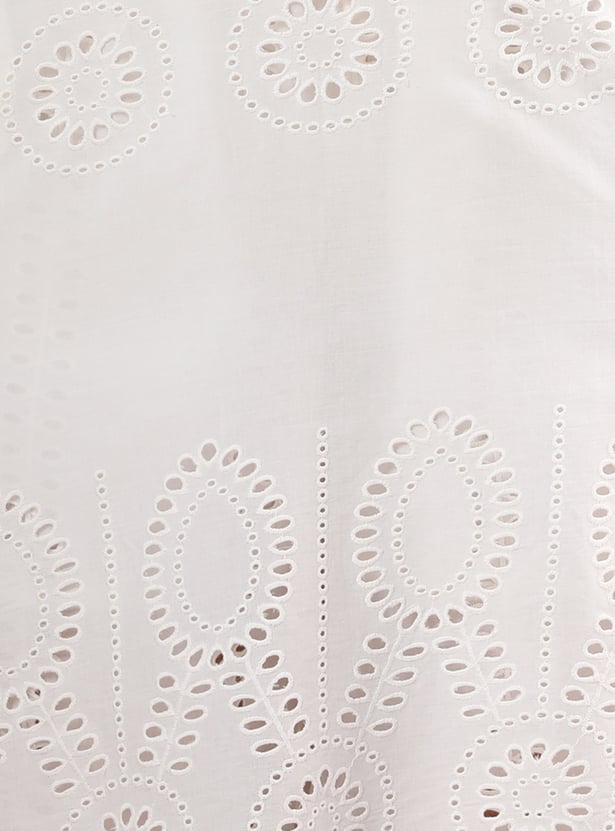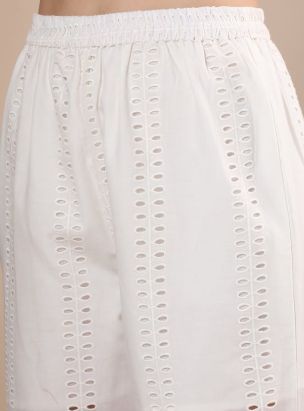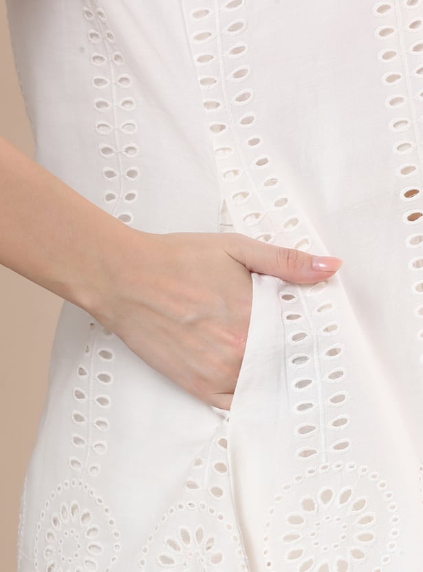 This kurta set is ideal for elegant occasions. The knee-length kurta features intricate Schiffli embroidery, a mock collar, and a sleeveless design for a chic look. The scalloped trim and waist pockets complete the look. The matching straight pants have an elasticated waistband and offer a comfortable fit.