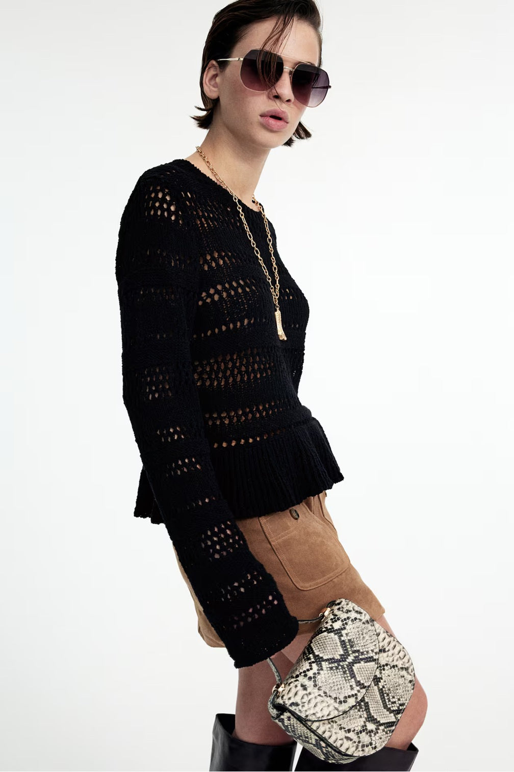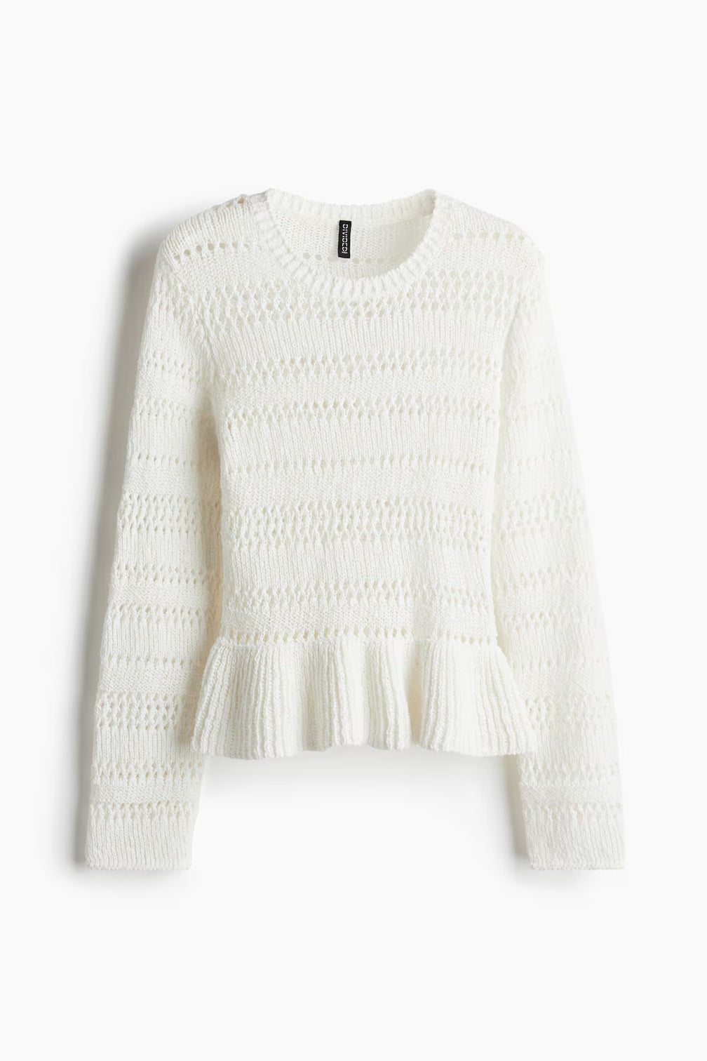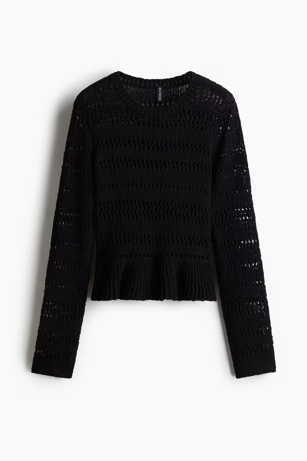 Jumper in a soft pointelle knit with a round, rib-trimmed neckline, long sleeves and a ribbed, flared peplum.