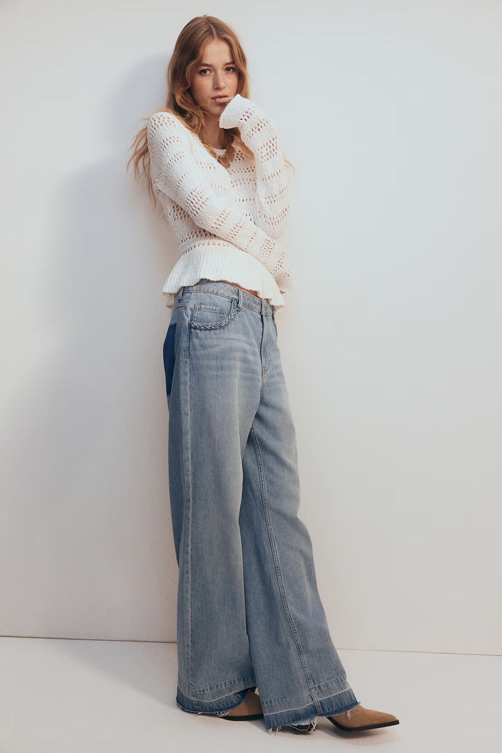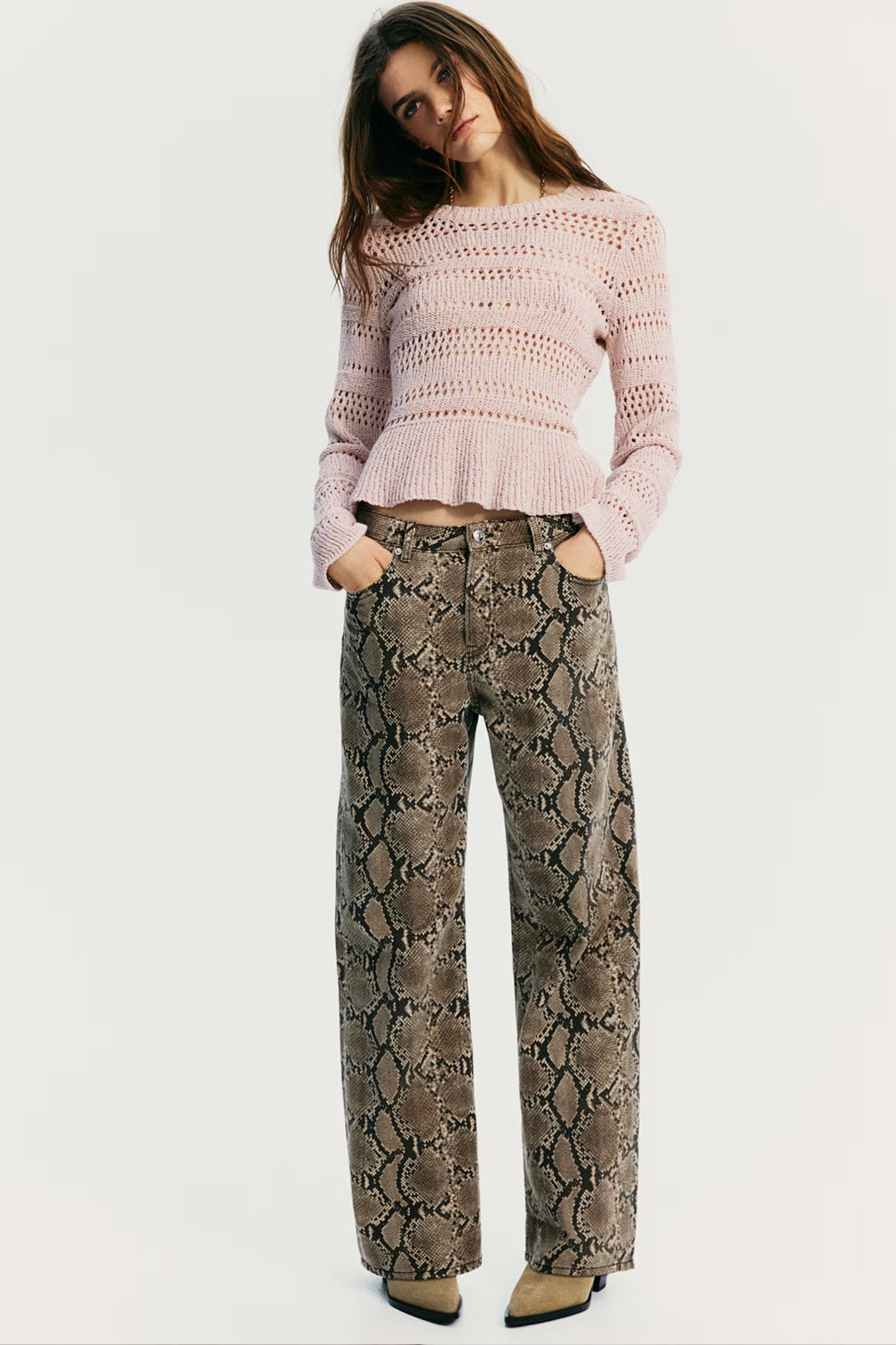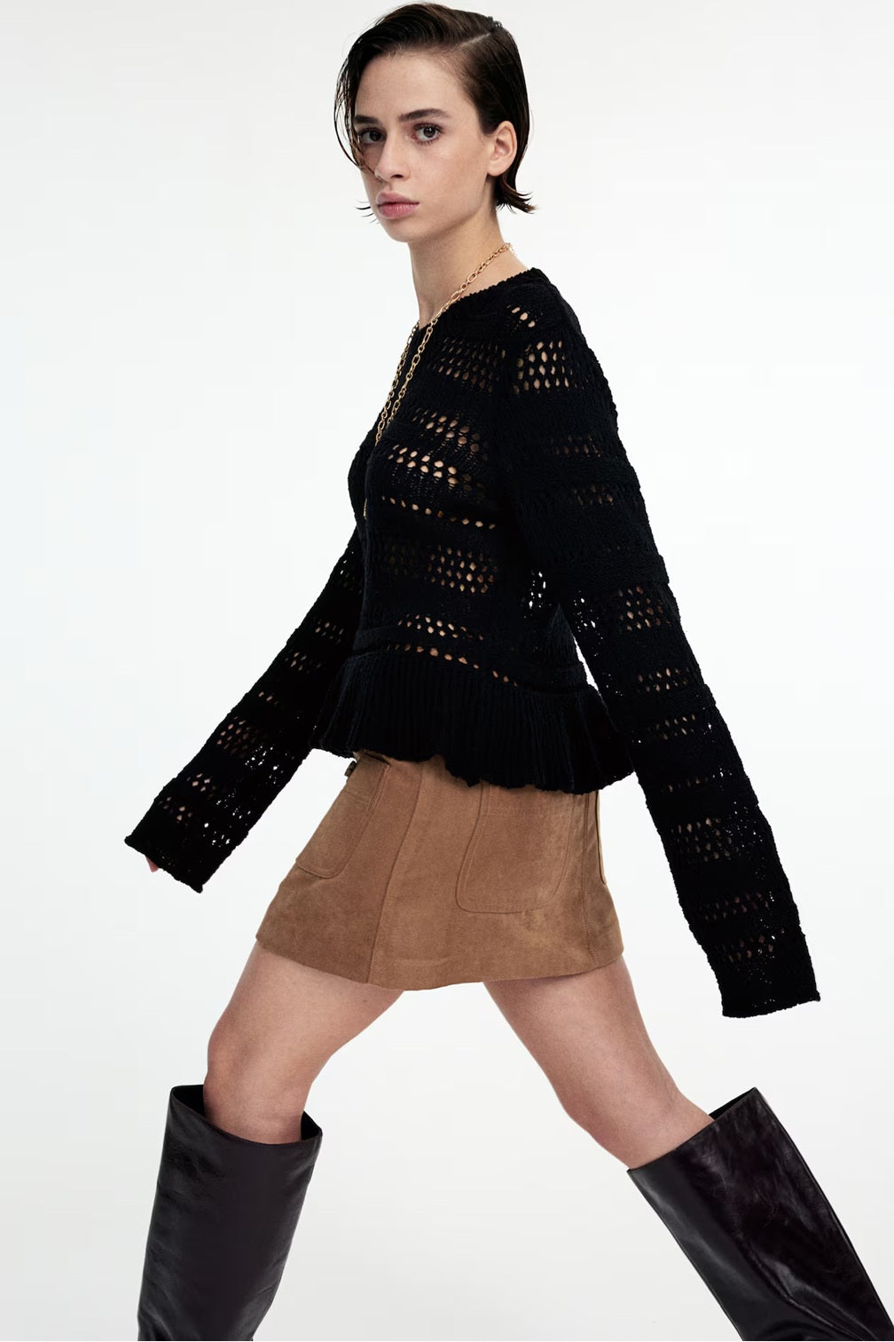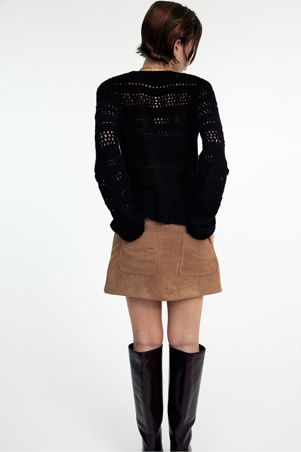 Jumper in a soft pointelle knit with a round, rib-trimmed neckline, long sleeves and a ribbed, flared peplum.