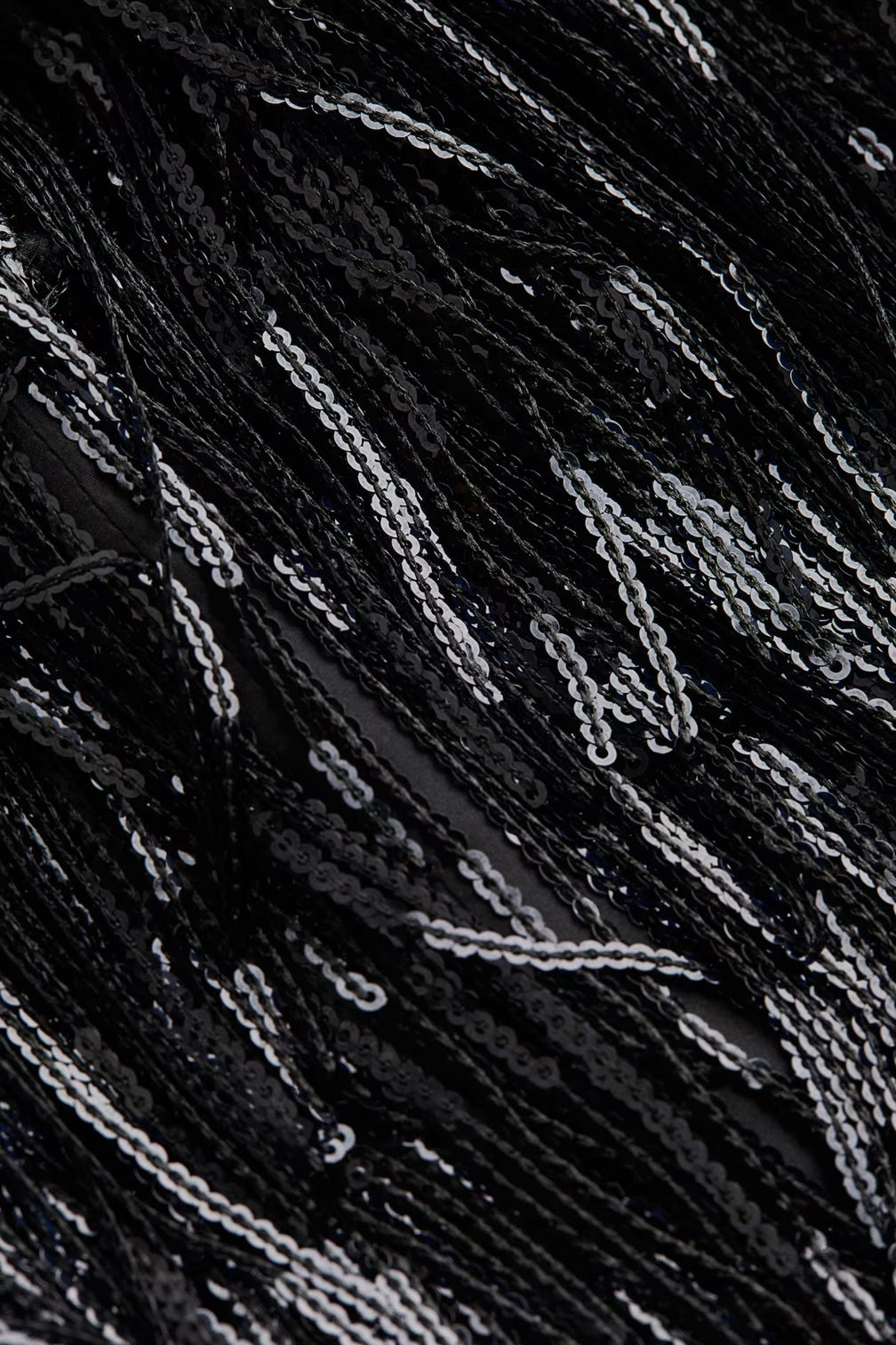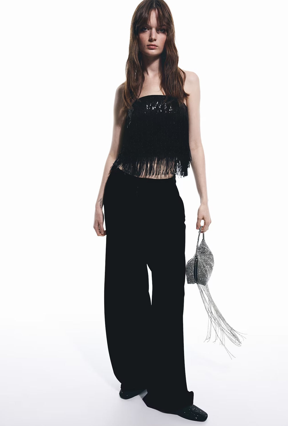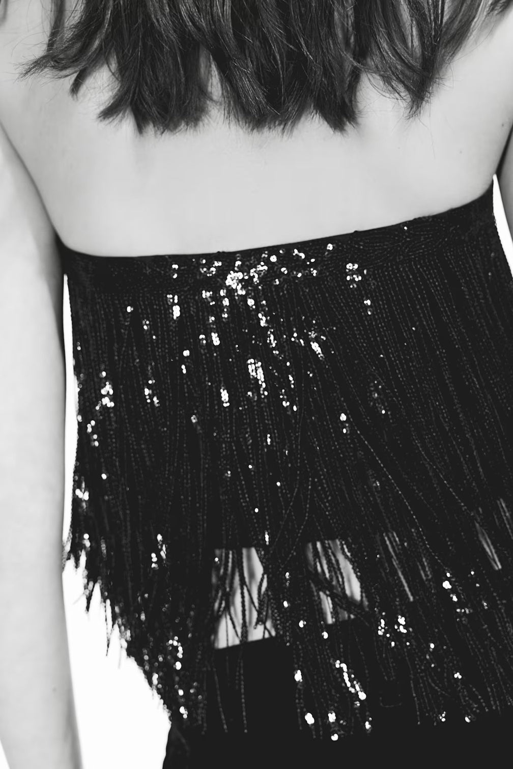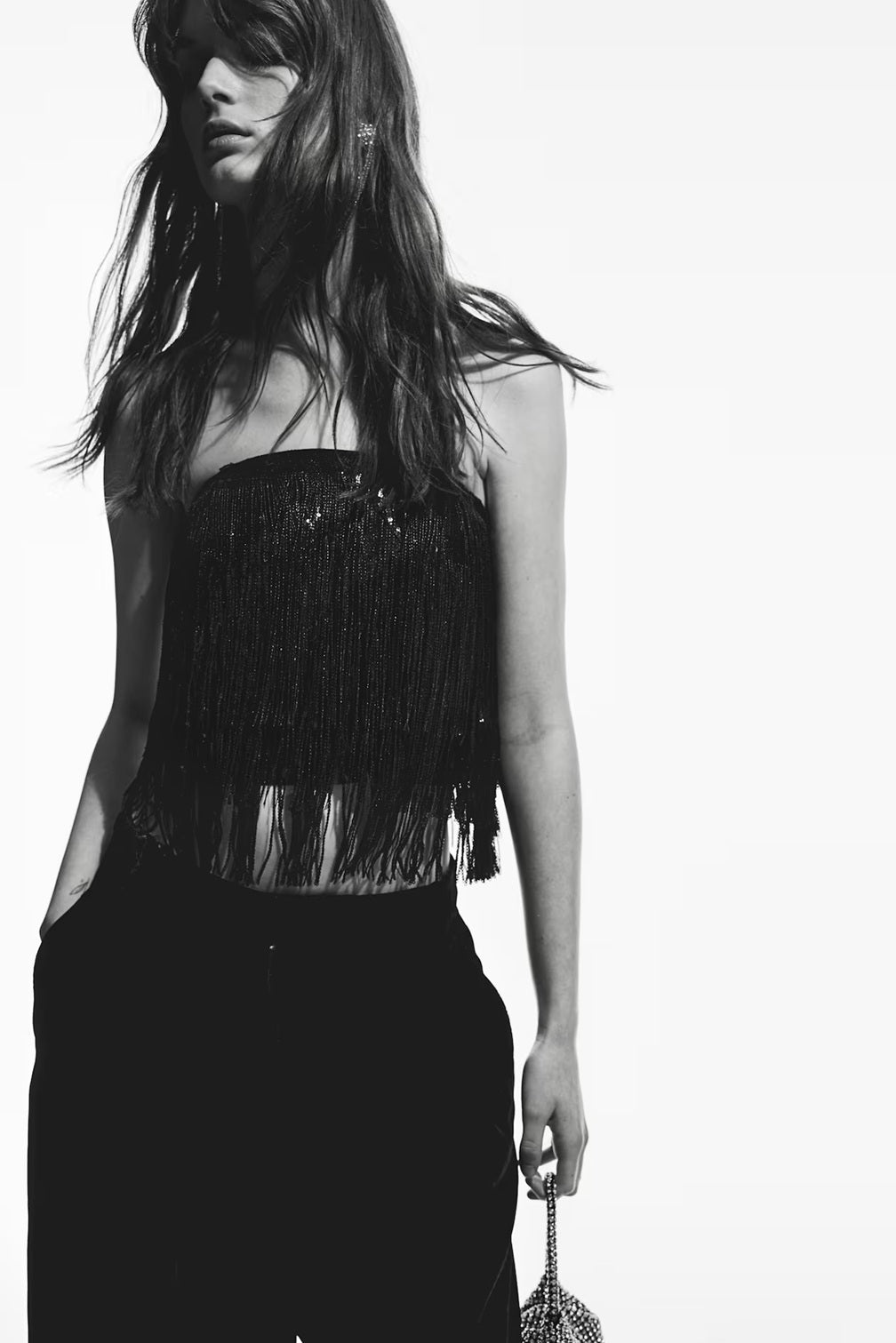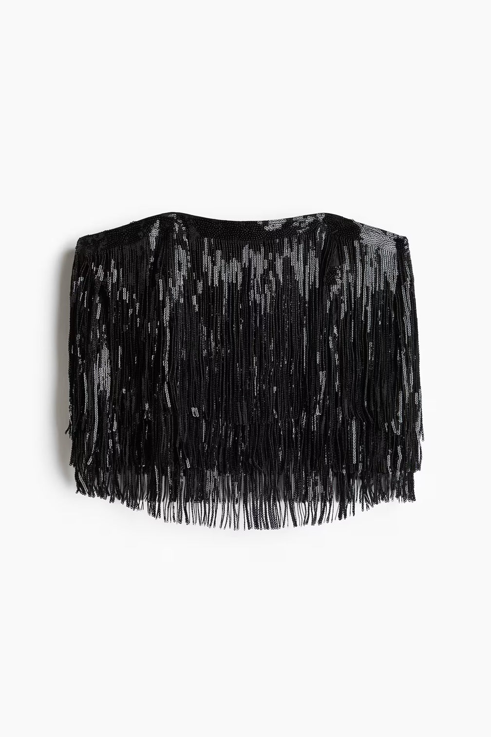 Cropped bandeau top in woven fabric covered in flowing, sequined fringes. Concealed silicone trim at the top, boning at the front to add shape and support, and a concealed zip at one side.