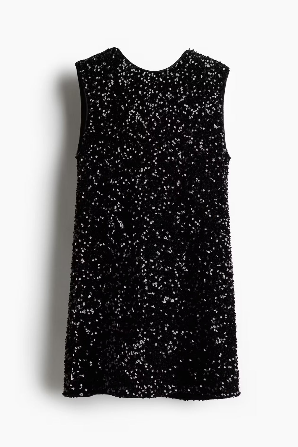 Short, sleeveless dress in sequined jersey. Loose fit with a round neckline and a deep V-neckline at the back with wide grosgrain ribbons that tie at the back of the neck.