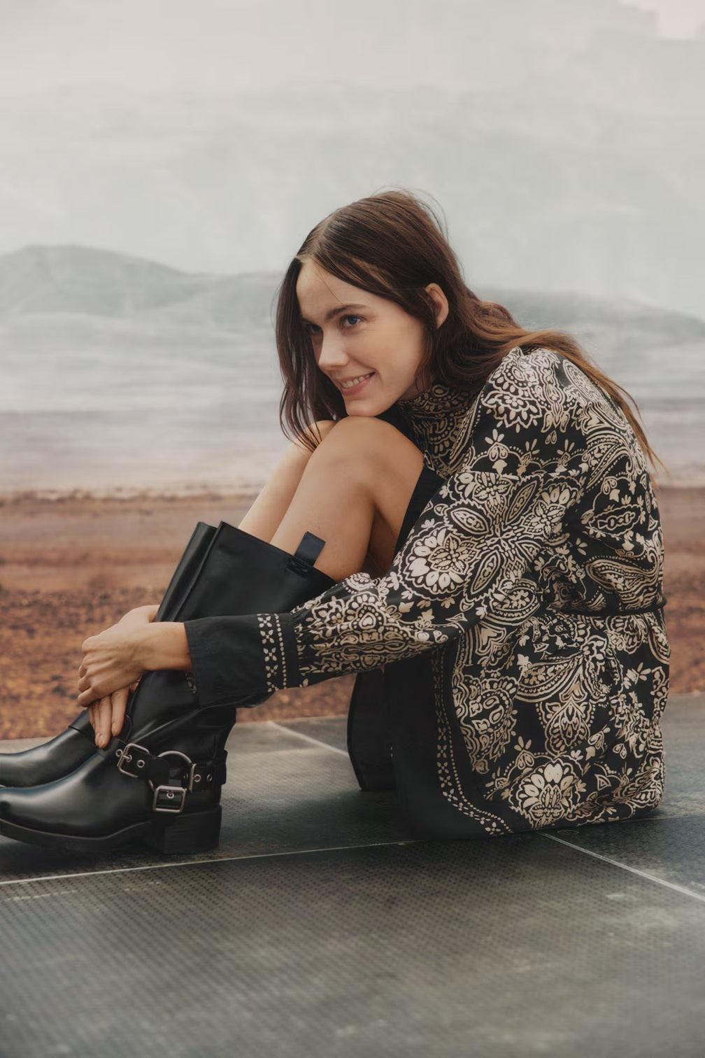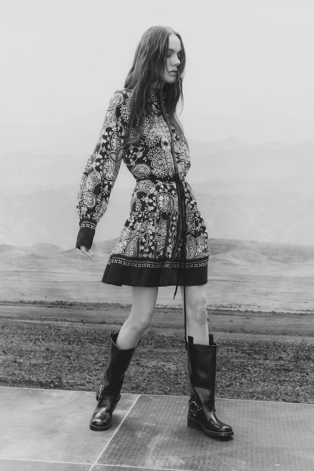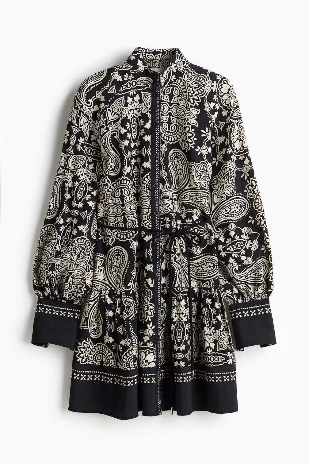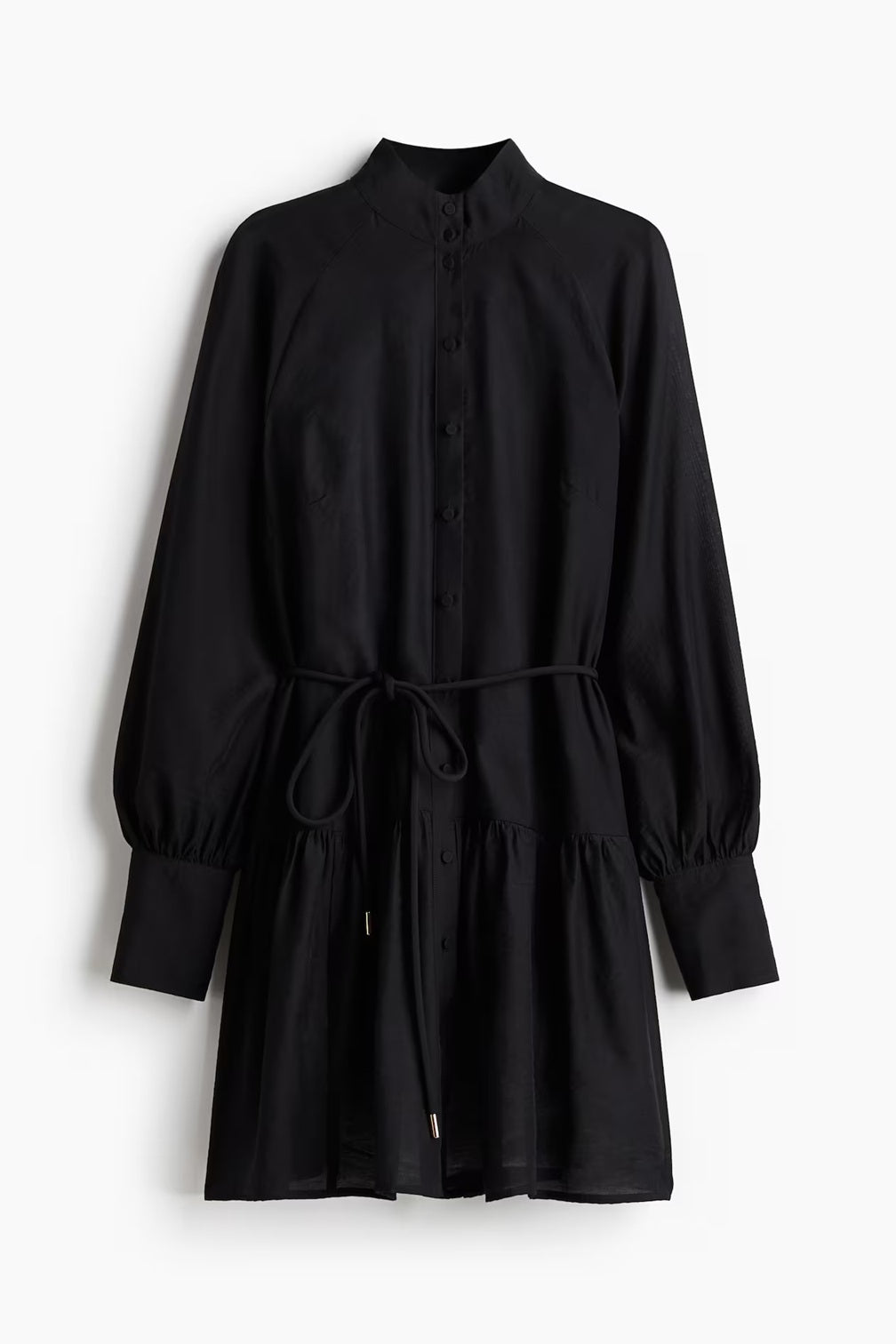 Short dress in woven fabric with a stand collar, buttons down the front and a detachable spaghetti tie belt at the waist. Long, raglan balloon sleeves featuring wide, buttoned cuffs and a sleeve placket with a link button. Gathered seam below the hips for added volume. Unlined.