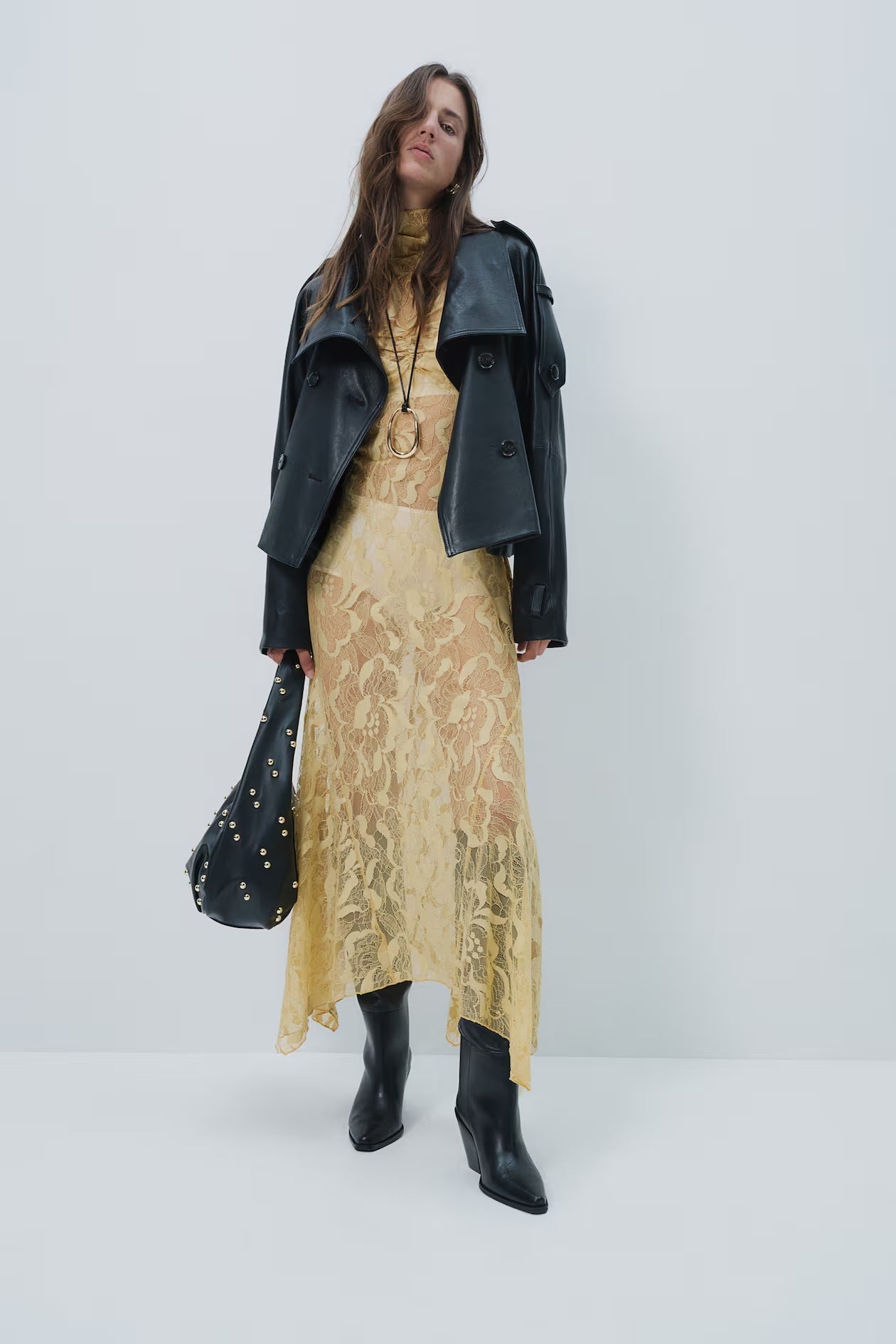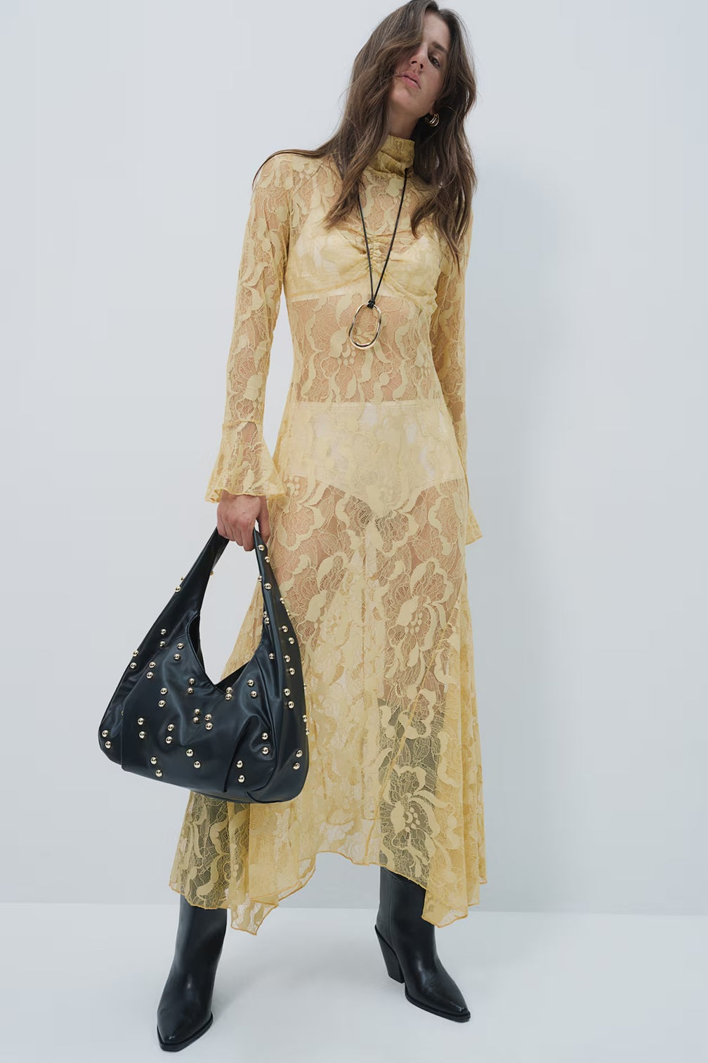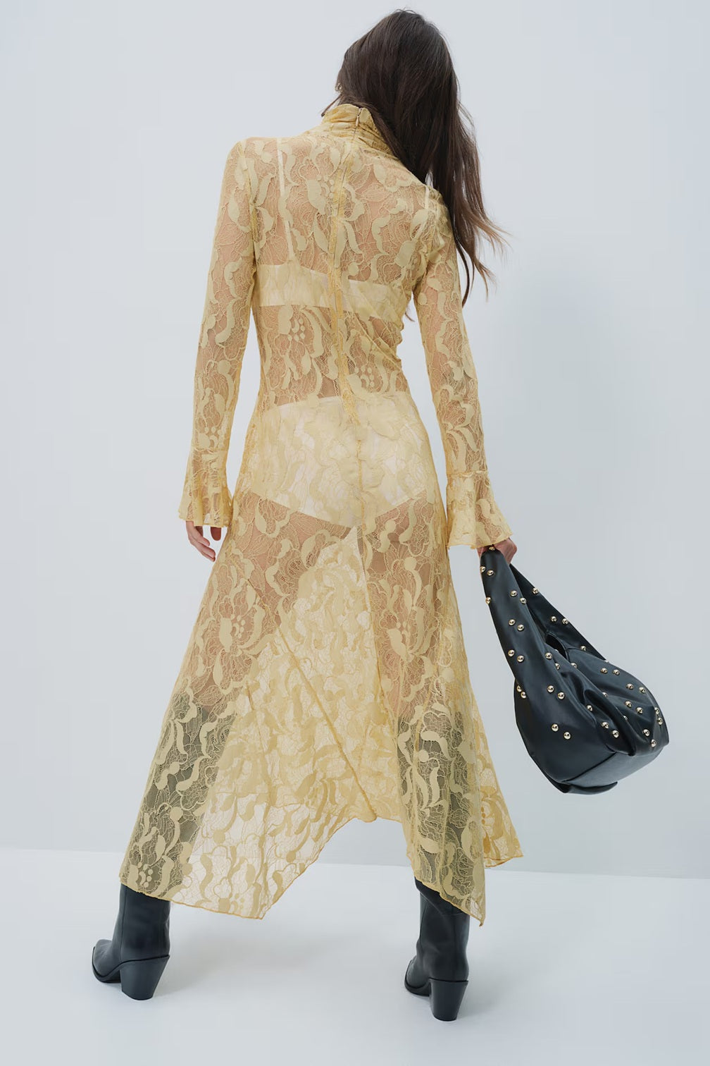 Fitted dress in lace with a turtle neck, gathered seam at the centre of the bust and long sleeves with flared cuffs. Concealed zip at the back and a flared skirt. Unlined.