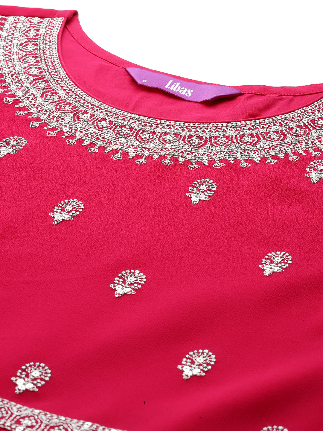 Hot Pink Embroidered Georgette A-Line Kurta With Palazzos & Dupatta