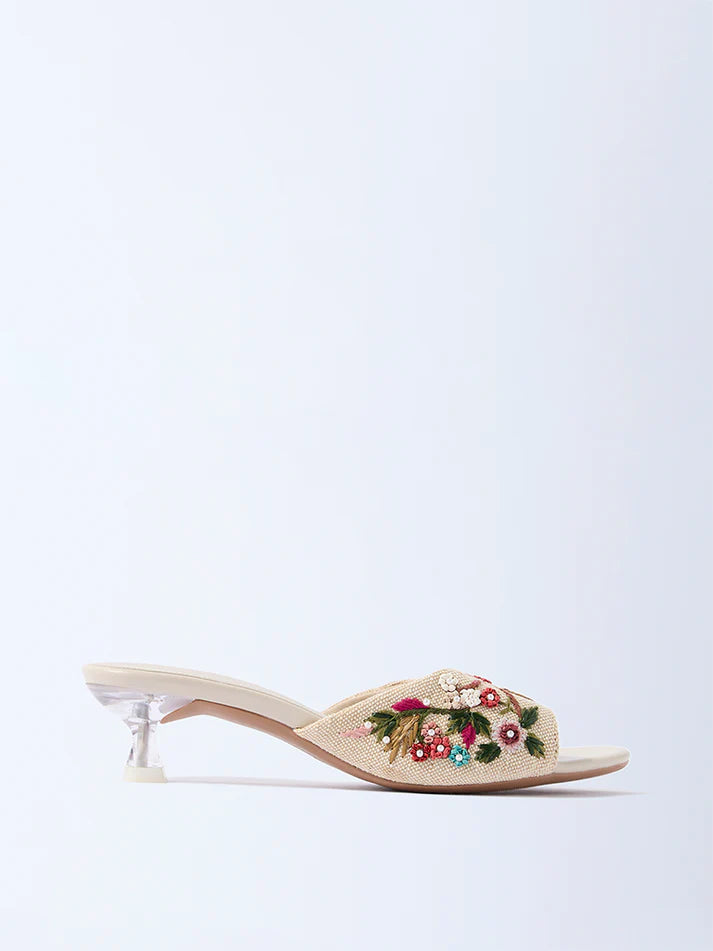 Step into elegance with these multicolour embroidered sandals from Luna Blu. Designed with intricate floral embroidery across a neutral base, they add a charming pop of colour to your look. The open-toe design and comfortable mid-heel make them perfect for pairing with both festive ensembles and chic casual outfits. Finished with a transparent block heel for a modern twist, these sandals beautifully balance style, comfort, and sophistication.