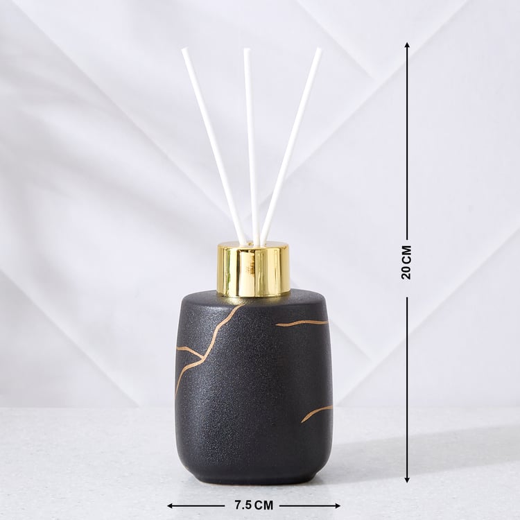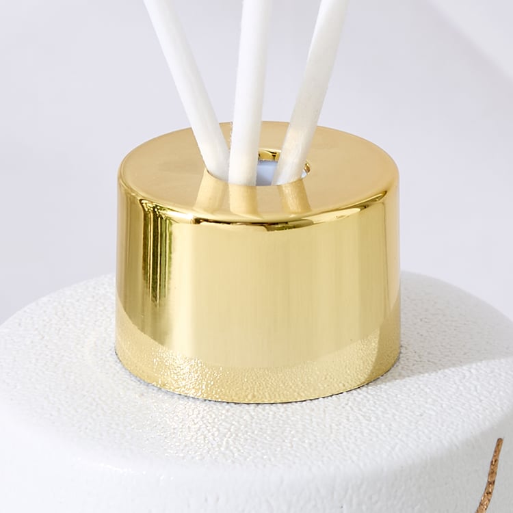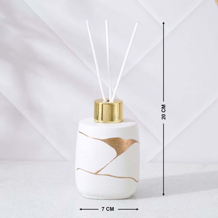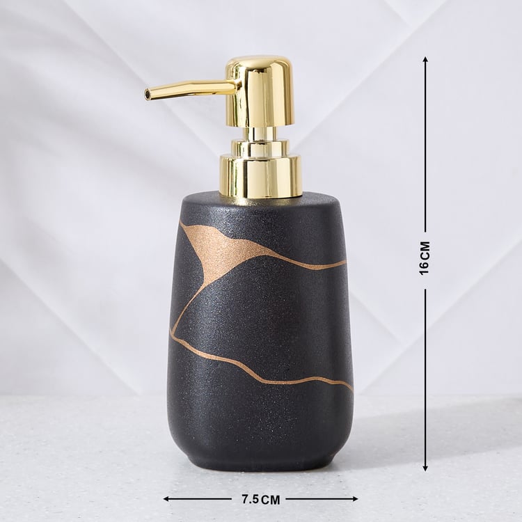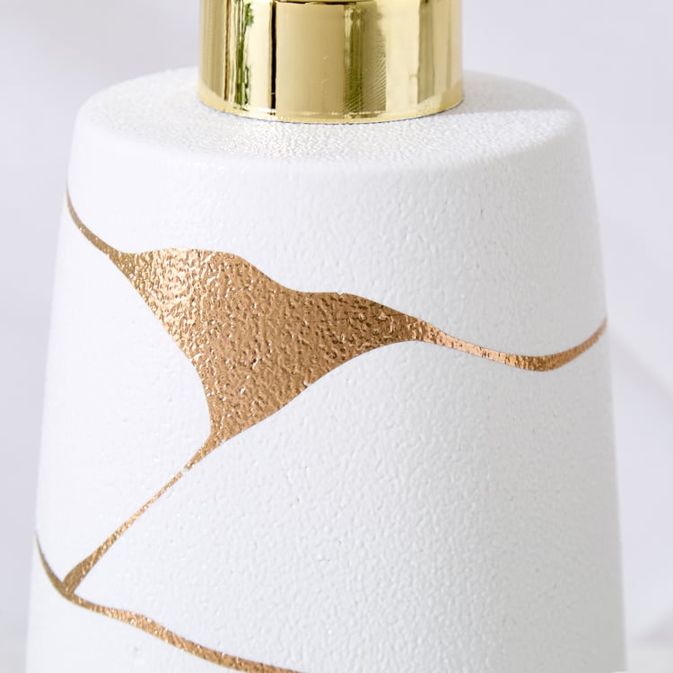 Soap Dispenser : Elevate your bathroom decor with this bathroom accessory set, crafted from durable ceramic. Featuring prints, this coordinated set includes a soap dispenser, a reed diffuser and a tray. The smooth finish with metallic detailing adds a touch of elegance while keeping your essentials organised.