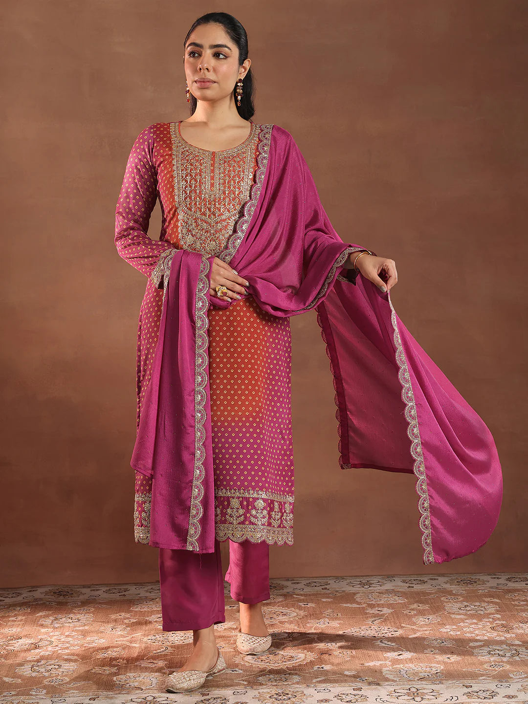 Pink Printed Silk Blend Straight Suit With Dupatta