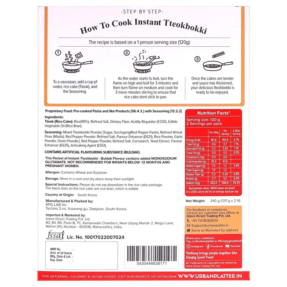 Urban Platter Instant Tteokbokki Buldak Flavour Rice Cakes 240 g