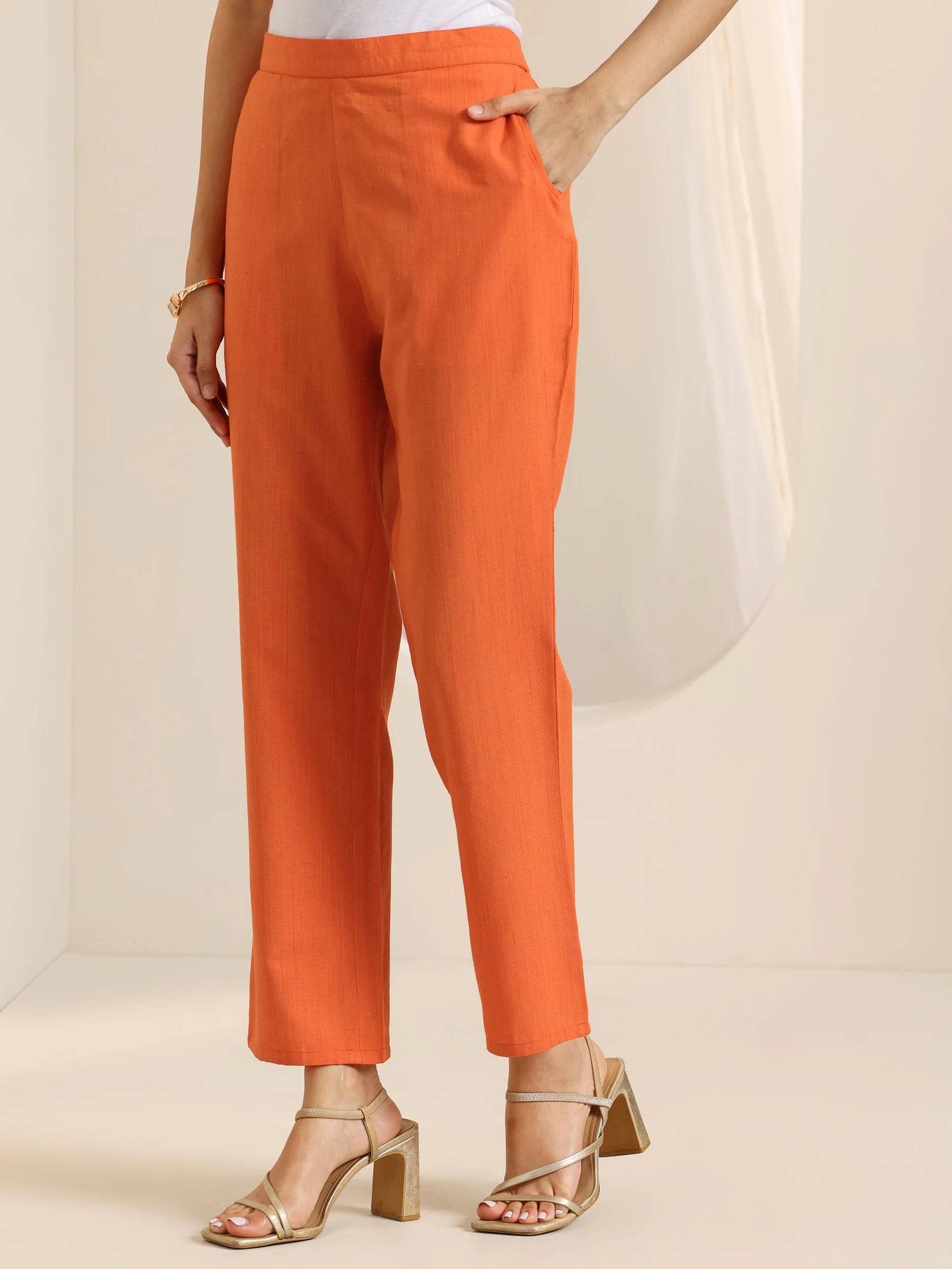 Our 3-piece white and orange cotton blend kurta set features a straight-fit kurta with a V-neckline, regular sleeves, and a statement yoke. Complemented with straight pants with an elasticated waistband and a printed dupatta. Adorned with self-design, this style is perfect for casual occasions.
